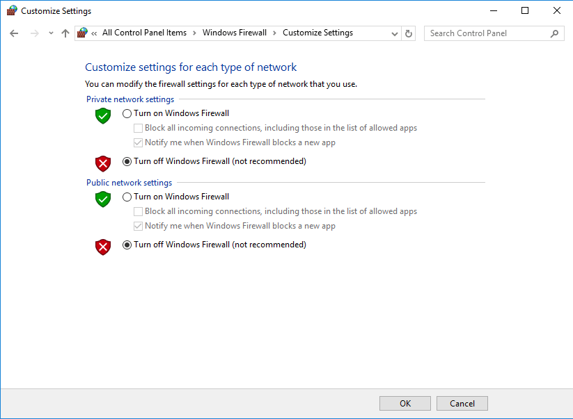 Here’s how to do it: click on Cortana and, in the search field, type - Windows Firewall, then click Enter. Click the Disable button. In the new window, click “Disable Windows Defender Firewall” -> Ok.