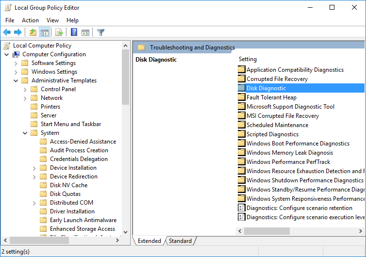 Go to Computer Configuration and then enter these folders respectively: Administrative Templates --> System --> Troubleshooting and Diagnostics --> Disk Diagnostics.
