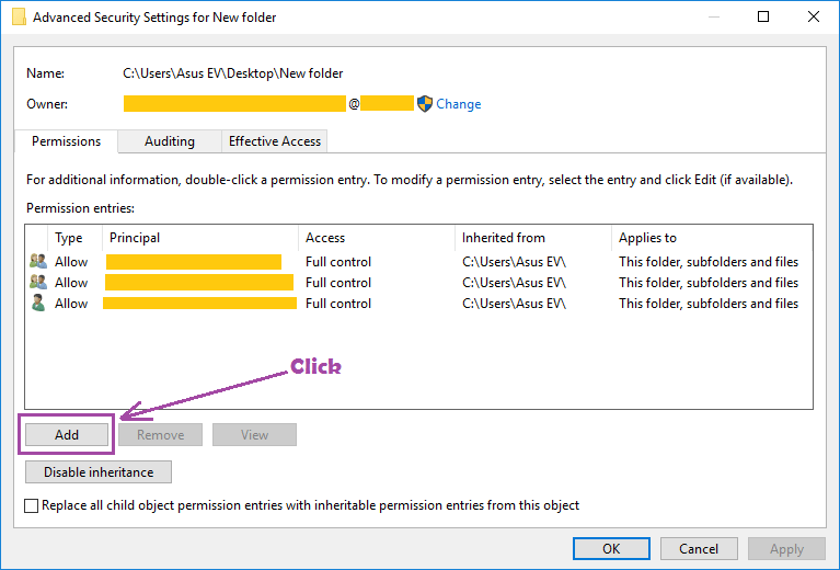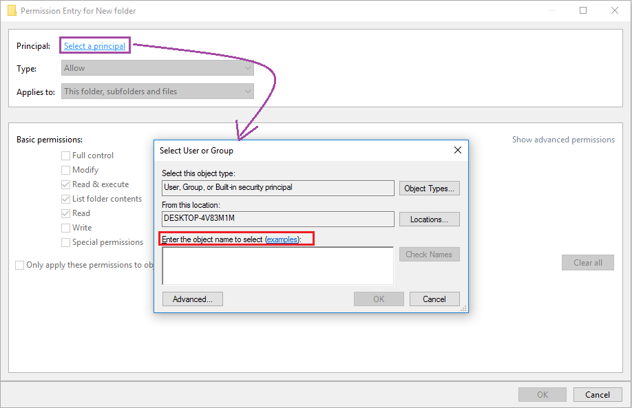 The window "Select User or Group" will open. Type on the keyboard your user name and click OK. Now, return to the Advanced dialog box and put the tick next to “Replace all permission entries ...” and click OK.