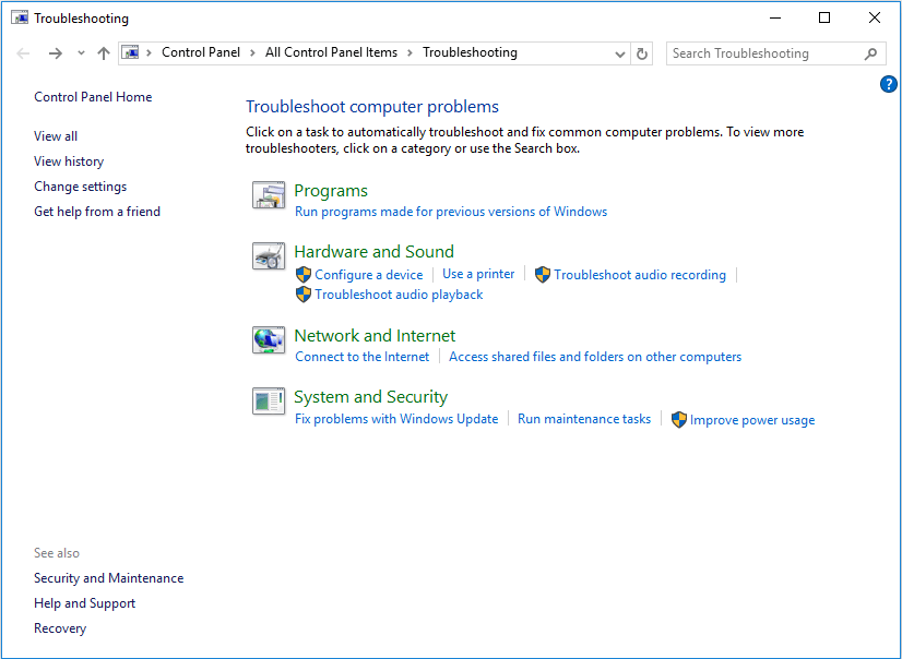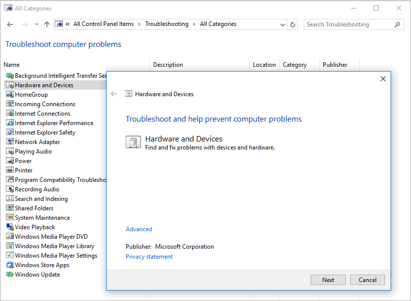 Enter the Control Pannel -> All Control Pannel. Then click on “Troubleshooting”; now left-click on “Hardware and Devices”.