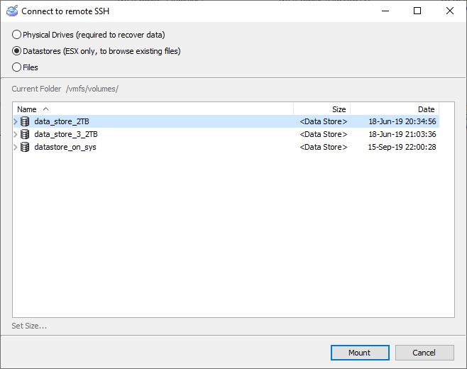 With this method, you can mount any file from an ESX (ESXi) server. This method includes both methods #1 and #2. You can look up Datastore at /vmfs/volumes/. The hard drives are located at /dev/disks/