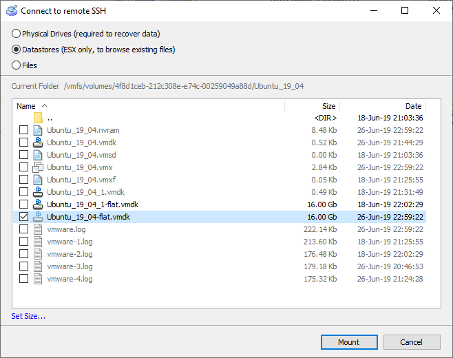 Select a folder with the virtual machine being recovered. There, select *.vmdk (or other type) files to mount.