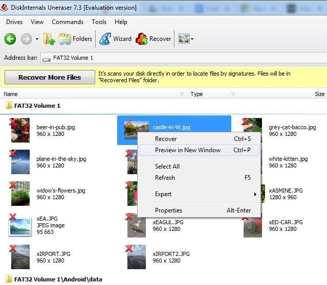 Step 4. Preview. Recovered files are marked in red in the upper left-hand corner. Right-click on "Preview in New Window" and select all the files you want to restore.