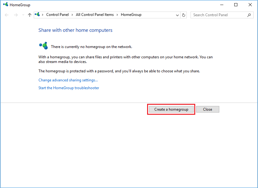 The window for creating a homegroup will open. As mentioned, the homegroup setup process is as easy as could be and has a built-in wizard. Click the button Create Home Group.